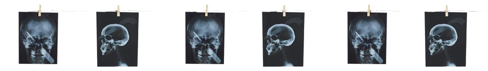Photo cards showing skull type xrays with embedded objects. 63 inches long with photo cards attached.