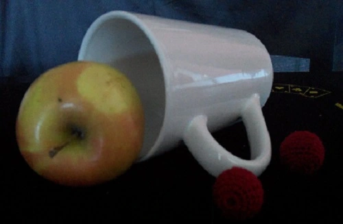 Large Chop Cup Coffee Mug: 4 1/2″ tall, Mouth is 3 1/4″. Produce a large load from this chop mug. Porcelain. Comes with a set of knitted chop cup balls, and directions.