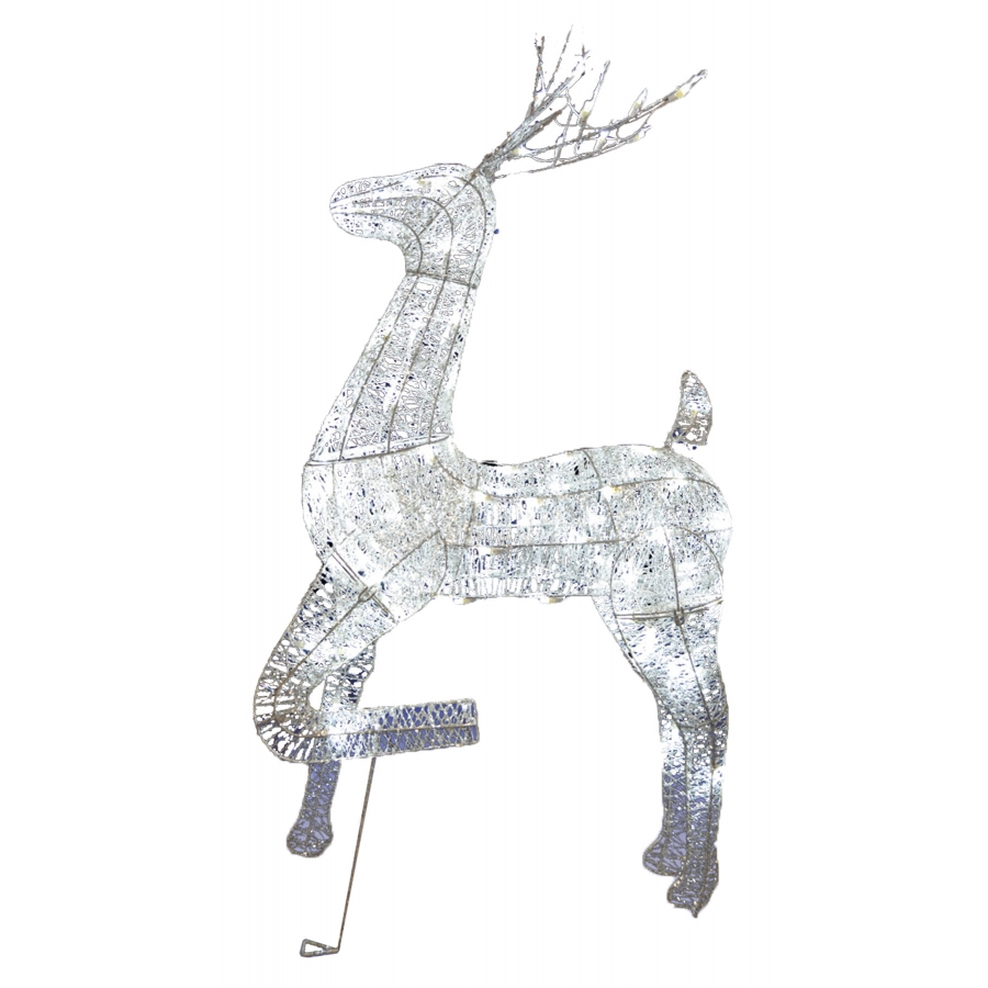 BUCK WIRE FRAME 48 Inches. This impressive Christmas buck will be an exciting addition to any holiday outdoor scene. He is covered in white glitter with 100 mini lights to give him his festive Christmas glow. He has a powder coated wire frame designed for all weather conditions. Pair with the Feeding Doe for a complete Christmas heard this season. He measures 27”x 12”x 48” and comes with 4 ground stakes.