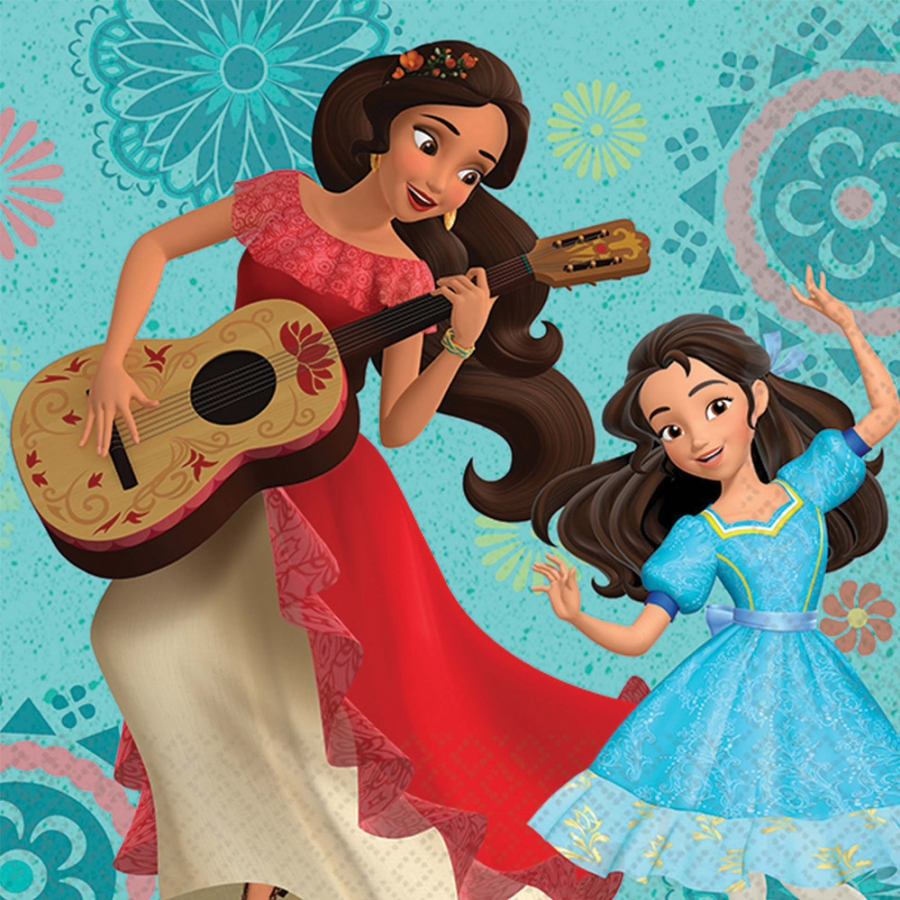 ELENA OF AVALOR BEV NAPKIN. Snack time in Avalor can get wild, so be prepared with Elena of Avalor Beverage Napkins! Featuring Elena playing guitar and dancing with Isabel on a blue flower background, these small colorful napkins are great for cleaning up snacks or small spills. Paper napkins are perfect for your little girl’s Elena of Avalor party or any special occasion. 16 per package, 5in x 5in when folded, and 2-ply paper.