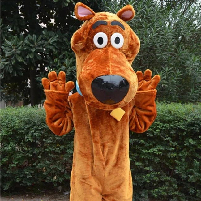 Giant Scooby Doo Mascot Costume. Scooby Doo, a real household name, is a male Great Dane and is the lifelong companion of Shaggy. He and Shaggy seem to feed off each other and this is apparent through their similar personality. Shaggy is always hungry, scares easily and most of the time, refuse ot help others until he is encouraged by Scooby snacks, a bone shaped dog threat. Here we have Giant Shaggy is his trademark look, brown all over with a blue color and diamond shaped tag. Be a scaredy cat detective that is loved by many with this costume.