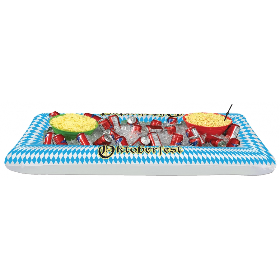 INFLATABLE OKTOBERFEST BUFFET. Keep your food and beverages nice and cold with our Inflatable Oktoberfest Buffet Cooler! This festive blue and white diamond print, with printed “Oktoberfest” logo stretches 28in wide X 53 inches long. PVC. Must be inflated. Just the decoration you need for Oktoberfest, other fun productions and festivities, or just because!