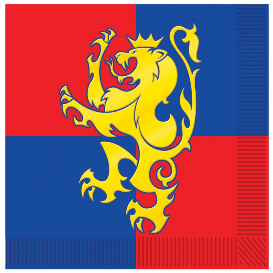NAPKIN MEDIEVAL BEVERAGE 16PCS. The perfect napkin for your medieval-themed event. Gold lion on red and blue field. Paper. 16 napkins per item. Perfect for beverages.