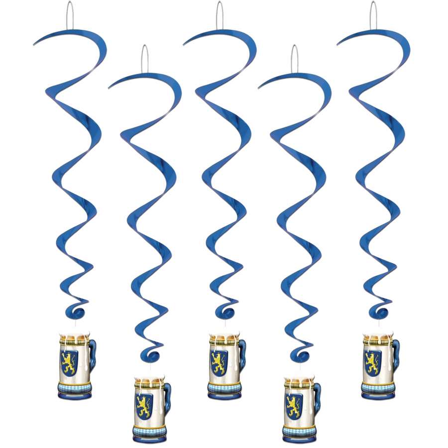 OKTOBERFEST WHIRLS. These special Oktoberfest whirls will make your celebration complete! Blue metallic whirls with a frothy beer mug at the bottom! Metallic whirls. 5 whirls per item. 3ft 4in.