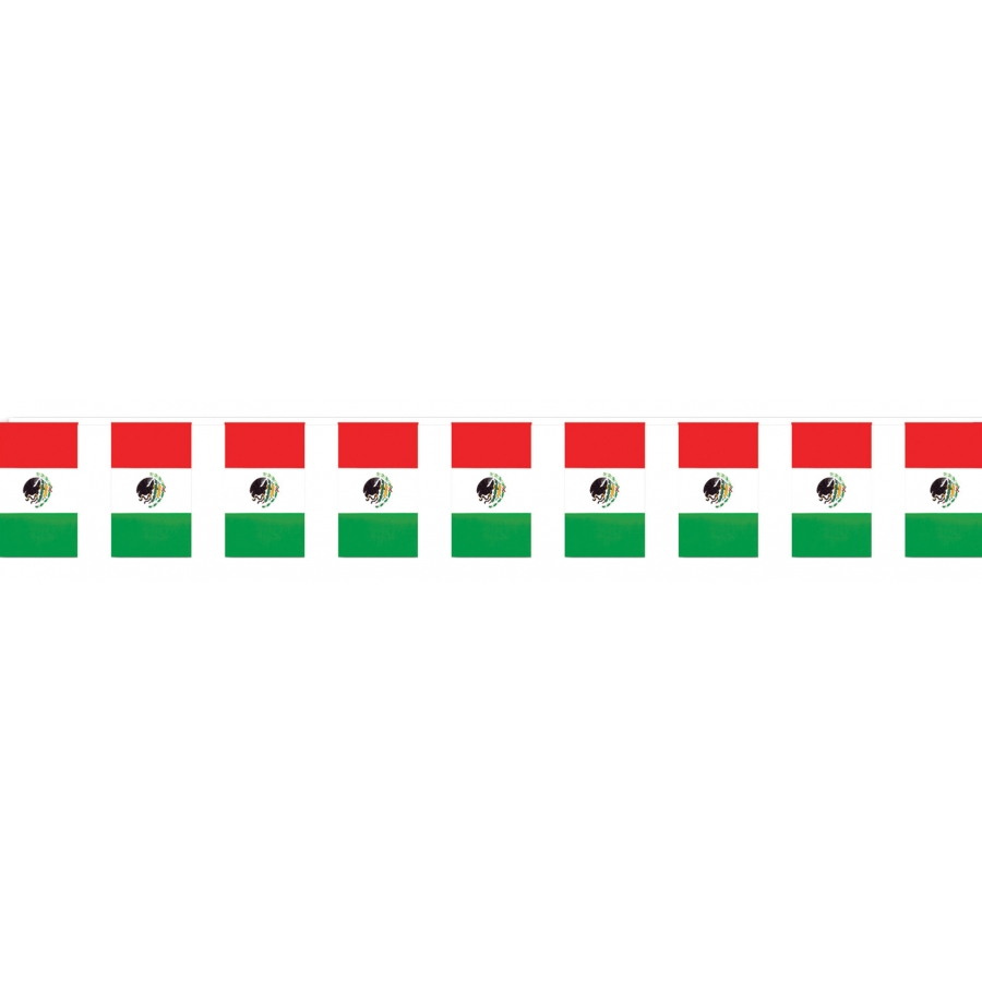 OUTDOOR MEXICAN FLAG BANNER. The perfect banner for your Cinco De Mayo celebration! Polyethylene. 30 flags on a string. One string per item. 17in x 60 ft.