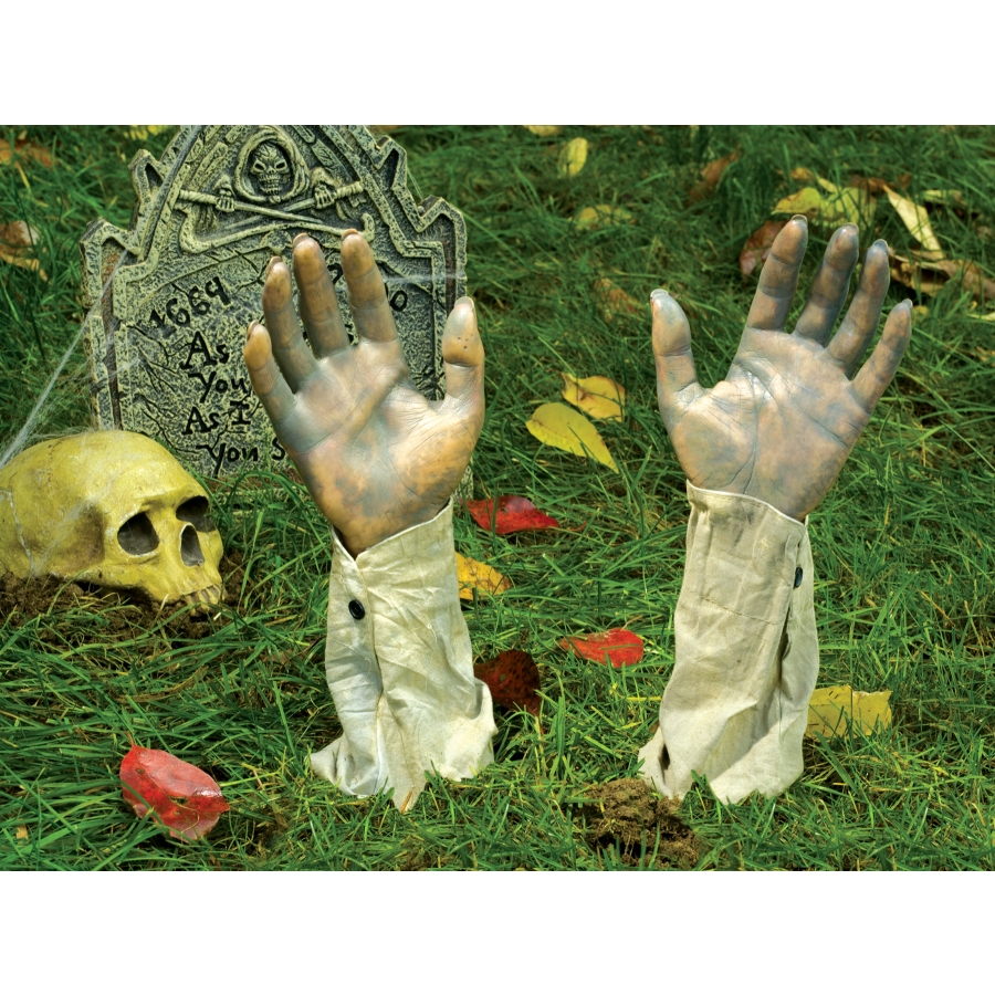 REAL ARM GROUNDBREAKER PAIR. Someone wants out! Terrify the neighborhood with this pair of life-size hands that appear to be breaking right out of the ground. 13″ length
