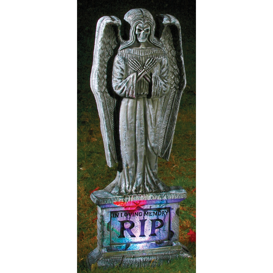 TOMBSTONE GOTHIC 24 LU ANGEL. 24 inch light-up tombstone has angel sculpture. Requires 3 LR44 batteries, NOT included. Item itself is 24 x 9 1/2 x 3 inches